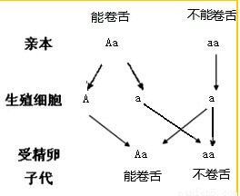 (3)显性基因用A表示,隐性基因用a表示.不能卷舌的基因组成是aa.第三组家庭子女不能卷舌的基因组成是aa,其中一个a一定来自父母,因此父母中能卷舌的基因组成是Aa.遗传图解如图: