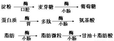 点评:此题考查了淀粉、蛋白质、脂肪的起始消化部位(口腔、胃、小肠)以及这些物质被彻底消化的器官---小肠.