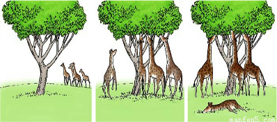 分析:此题考查的是对自然选择和长颈鹿长颈的形成的认识.自然选择是指自然界中的生物,通过激烈的生存斗争,适应者生存下来,不适应者被淘汰.长颈鹿长颈的形成是长期自然选择的结果.