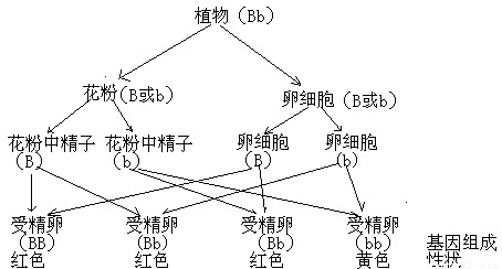 (2)对于有性生殖的生物来说,部分细胞在生殖器官中进行一种特殊的分裂,使遗传物质在新生细胞中减半,在花药中的细胞原来成对的染色体、基因会分开存在于不同的细胞中,故花粉说携带的基因将是B或b,同理,在②卵细胞中基因也将是B或b,那么形成受精卵时的可能基因组合为BB(红色)、Bb(红色)、bb(白色),所以形成的种子长成的植株,再开出花的颜色可能是 红色或白色.而花色在遗传学上称为性状.遗传图解为:
