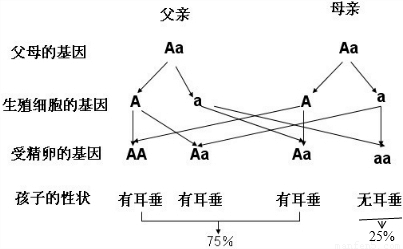 解:子代中出现了亲代中没有的性状(无耳垂),这个新出现的性状一定是隐性性状,控制这个性状的一对基因都是隐性的,分别来自于父母双方,即父母双方的基因组成都是杂合体.假定有无耳垂这一相对性状由基因A、a控制,则这对基因的遗传图解如图所示:因此对夫妇的基因组成是Aa和Aa,则该夫妇再生一个无耳孩子的几率是25%.