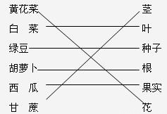 解答:解:黄花菜是花,白菜是叶,绿豆是种子,胡萝卜是根,西瓜是果实,甘蔗是茎.