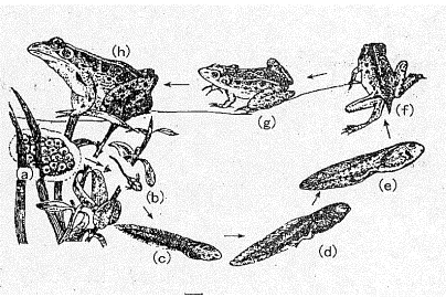 青蛙的发展过程包括:受精卵(a)→蝌蚪(外鳃(b)→内鳃(c→e))→幼蛙(g)→成蛙(h).