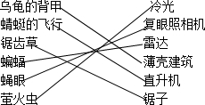 解答:解:随着科学技术的迅猛发展,仿生技术的应用日益广泛,如人类模仿乌龟的背甲制造了薄壳建筑;模仿萤火虫的发光原理制造了冷光灯;模仿蝙蝠的回声定位发明了雷达,直升飞机利用螺旋桨搅动气流是模仿的蜻蜓的飞行.模仿锯齿草的叶制造了锯子,模仿蝇眼制造了复眼照相机.