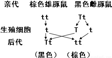 (2)①棕色为隐性性状,其体内的一对基因均为隐性基因,即tt.②子代表现为显性性状,其体内一定含有显性基因T,其亲代中的棕色豚鼠一定为子代提供一个t基因,所以子代的基因组成为Tt.如下图: