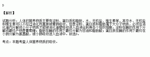 C、淀粉、脂肪、蛋白质 D、水、无机盐、维生素