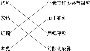 科目:初中生物 来源: 题型: 请你把下列生物与它的结构特点或生理特征相对应: ①家鸽 A.体表有许多环节组成 ②蚯蚓 B.单细胞生物,没有成形的细胞核 ③家兔 C.胎生、哺乳 ④细菌 D.无细胞结构 ⑤真菌 E.前肢变成翼 ⑥病毒 F.个体较大的种类、能产生孢子. 查看答案和解析>> 科目:初中生物 来源: 题型:解答题 请你把下列生物与它的结构特点或生理特征相对应: |