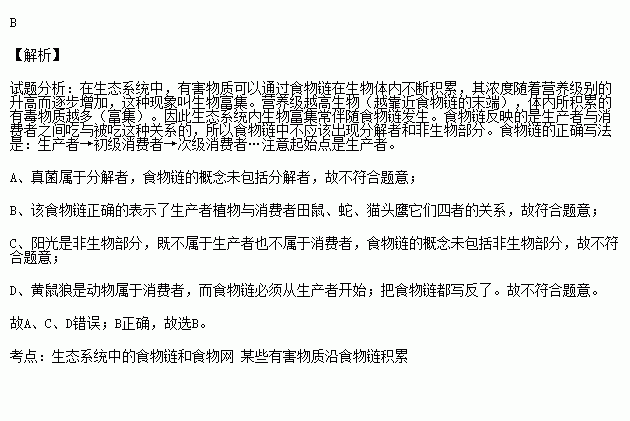 A.植物→真菌→田鼠→蛇 B.植物→田鼠→蛇→猫头鹰