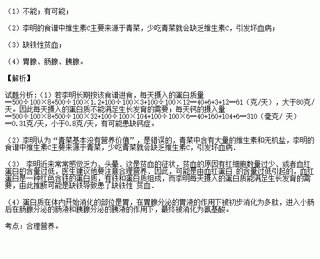 (1)、营养学研究提出:青少年的蛋白质供给应量应不少于80克/天,钙供给量应不少于800毫克/天,。若李明长期按该食谱进食,摄入的蛋白质能否满足生长发育的需要?