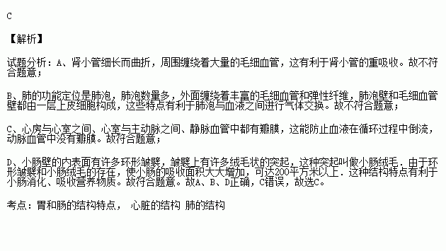 D. 小肠内表面有许多环形皱襞和绒毛,以增加小肠消化和吸收的面积