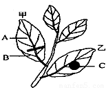 如图若将某植株一片叶的主脉切断(图中甲),另一片叶两面都贴上不透明的锡箔纸(图中乙),黑暗中放置24小时后再光照4小时.取下两叶经脱色后用碘液处理,发现A部位呈棕褐色,B部位呈蓝黑色,C部位不呈蓝黑色.以上实验能够证明光合作用需要( )
