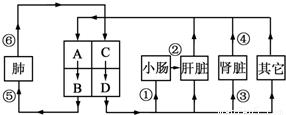 如图是人体血液循环示意图(其中A、B、C、D代表心脏的四个腔,箭头代表血流方向),请据图回答问题: