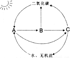 (8分)下图示生态系统各成分间的相互关系,A、B、C代表生态系统的生物部分,请分析回答: