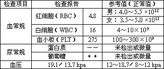 张大爷最近经常头昏、乏力,到医院做了相关检查,下表为部分检查结果(“+”代表检出,“-”代表未检出或微量)。则该患者