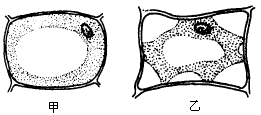 下图是甲、乙两个细胞处于不同浓度溶液下的显微图象,请回答: