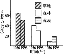 下图是科学工作者对我国北方地区森林、草地和荒漠面积变化的调查结果。