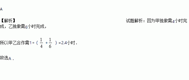 甲、乙两人完成一项工作,甲独做需4小时完成,乙独做需6小时完成,甲、乙合作,需多少小时完成。 ( )