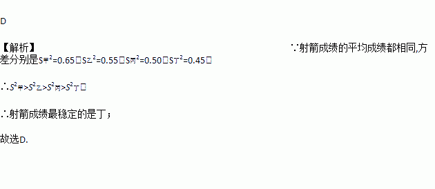 甲、乙、丙、丁四人进行射箭测试,每人10次射箭成绩的平均成绩都相同,方差分别是S甲2=0.65,S乙2=0.55,S丙2=0.50,S丁2=0.45,则射箭成绩最稳定的是( )