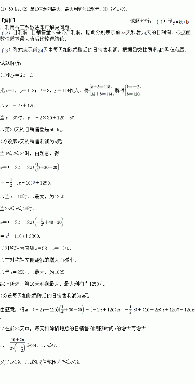 (3)在实际销售的前24天中,公司决定每销售1 kg水果就捐赠n元利润(n<9)给“精准扶贫”对象.现发现:在前24天中,每天扣除捐赠后的日销售利润随时间t的增大而增大,求n的取值范围.