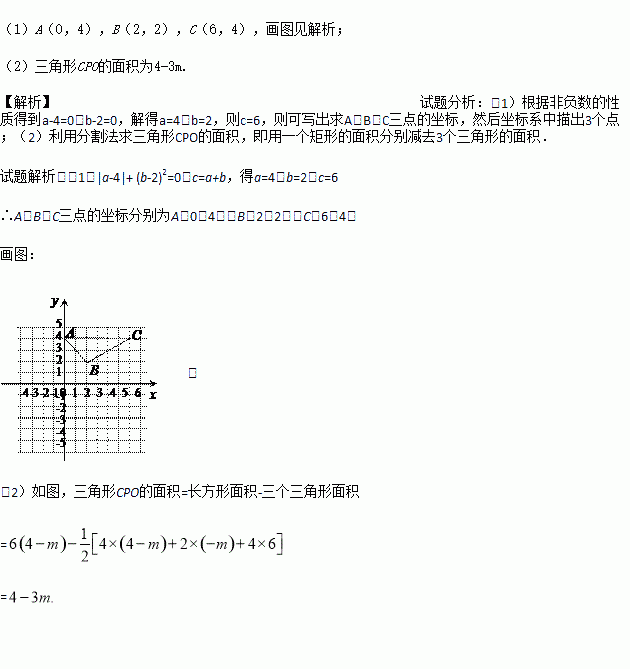 在平面直角坐标系中,O为坐标原点,已知A(0,a),B(b,b),C(c,a),其中a,b满足关系式|a-4|+ (b-2)2=0,c=a+b.