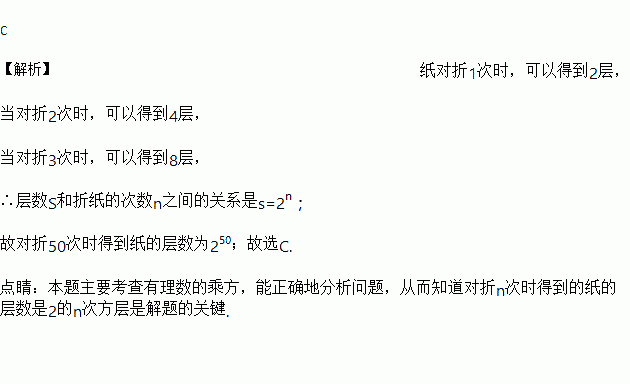 把一张纸对折一次得到两层纸,接着再对折一次得到四层纸,再接着对折一次得到8层纸,按照这样的规律连续对折50次,则可以得到纸的层数是( )
