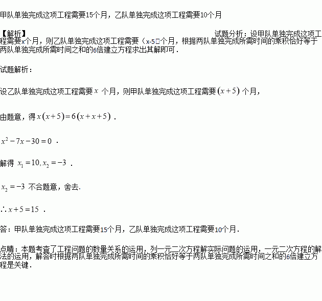 某项工程,甲队单独完成所需时间比乙队单独完成所需的时间多5个月,并且两队单独完成所需时间的乘积恰好等于两队单独完成所需时间之和的6倍.求甲、乙两队单独完成这项工程各需几个月?