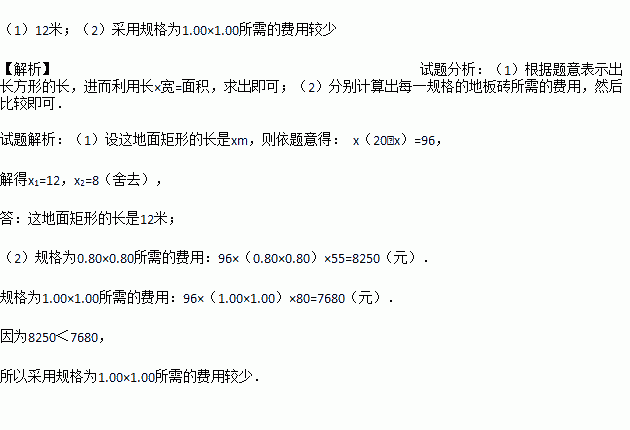 (2)有规格为0.80×0.80和1.00×1.00(单位:m)的地板砖单价分别为55元/块和80元/块,若只选其中一种地板砖都恰好能铺满储仓的矩形地面(不计缝隙),用哪一种规格的地板砖费用较少?