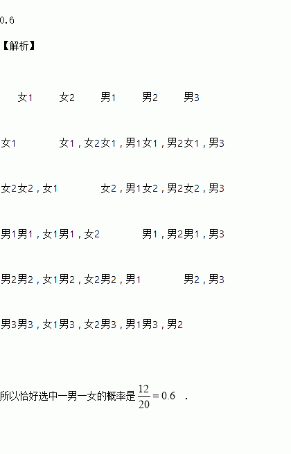 学校为了了解九年级学生“一分钟内跳绳次数”的情况,随机选取了3名女生和2名男生,则从这5名学生中,选取2名同时跳绳,恰好选中一男一女的概率是____.