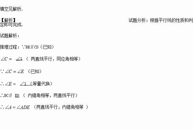 看图填空,BE∥CD,∠C=∠E,试说明∠A=∠ADE.