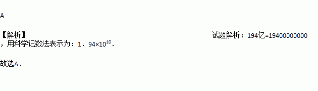 在我国南海某海域探明可燃冰储量约有194亿立方米.194亿用科学记数法表示为( )