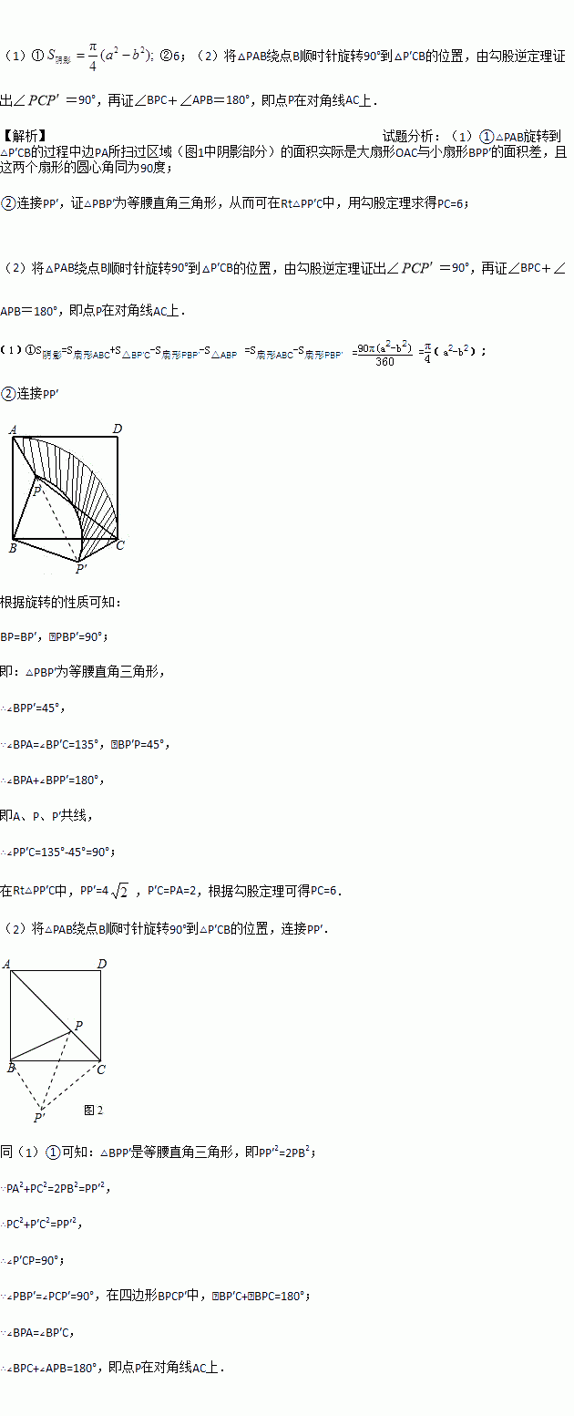 ①设AB的长为a,PB的长为b(b<a),求△PAB旋转到△P’CB的过程中边PA所扫过区域的面积;
