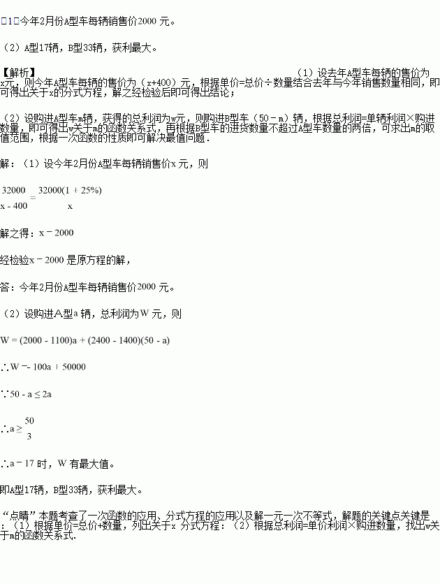 (1)求今年2月份A型车每辆销售价多少元?