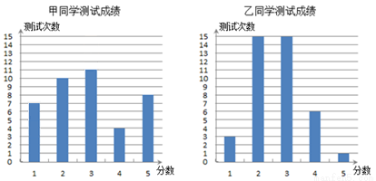 第24届冬季奥林匹克运动会,将于2022年2月在北京市和张家口市联合举行.某校寒假期间组织部分滑雪爱好者参加冬令营集训.训练期间,冬令营的同学们都参加了“单板滑雪”这个项目40次的训练测试,每次测试成绩分别为5分,4分,3分,2分,1分五档. 甲乙两位同学在这个项目的测试成绩统计结果如图所示.