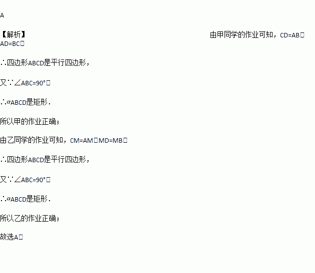 如已知:线段AB,BC,∠ABC = 90°. 求作:矩形ABCD. 以下是甲、乙两同学的作业: