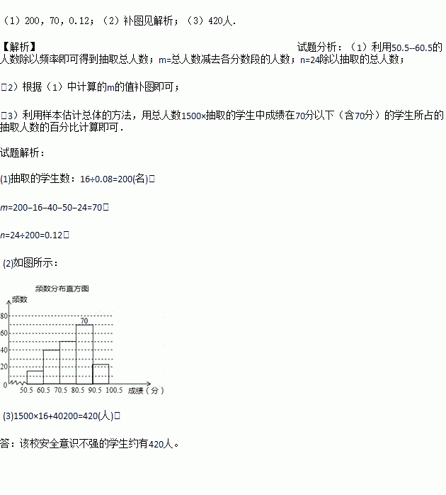 (3)若成绩在70分以下(含70分)的学生安全意识不强,有待进一步加强安全教育,则该校安全意识不强的学生约有多少人?