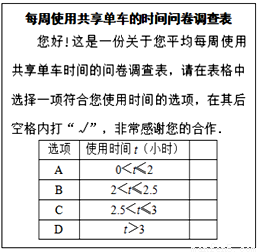 共享单车近日成为市民新宠,越来越多的居民选择共享单车作为出行的交通工具,某中学课外兴趣小组为了了解某小区居民每周使用共享单车时间的情况,随机抽取了该小区部分使用共享单车的居民进行调查(问卷调查表如图所示),并用调查结果绘制了图①、图②两幅每周使用共享单车时间的人数统计图(均不完整),请根据统计图解答以下问题: