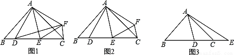 (3)如图3,若α=45°,点E在BC的延长线上,则等式DE2=BD2+CE2还能成立吗?请说明理由.