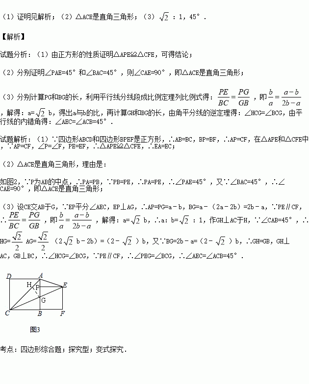 (3)如图3,若点P在线段AB上,连接AC,当EP平分∠AEC时,设AB=a,BP=b,求a:b及∠AEC的度数.