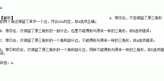 如图,小明把一块三角形的玻璃打碎成了三块,现在要到玻璃店去配一块完全一样的玻璃,最省事的办法是( )