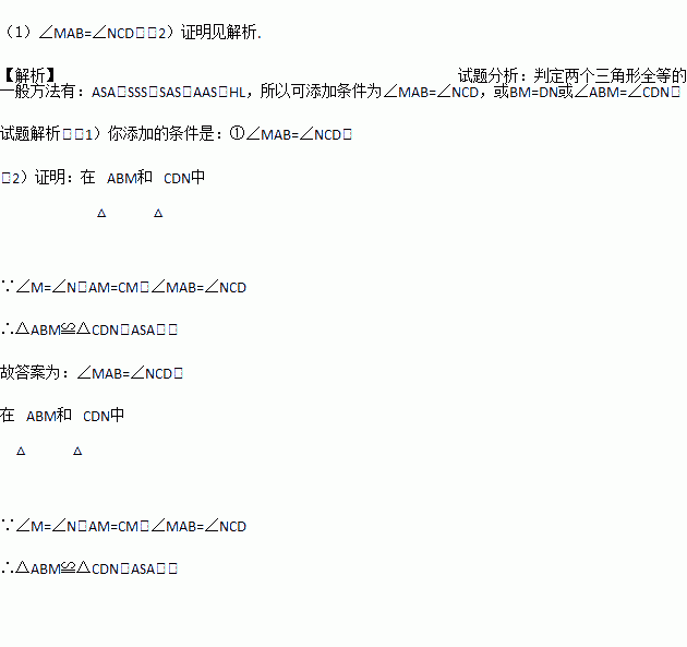 已知:点 A、C、B、D在同一条直线,∠M=∠N,AM=CN.请你添加一个条件,使△ABM≌△CDN,并给出证明.