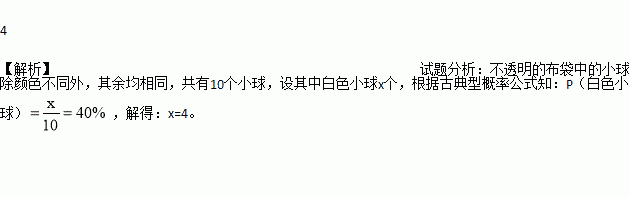 在一个不透明的袋子中有10个除颜色外其余均相同的小球,通过多次摸球实验后,发现摸到白球的频率约为40%,估计袋子中白球有__________ 个。