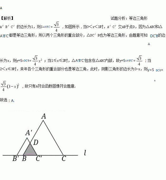 如图,边长为2的等边△ABC和边长为1的等边△A′B′C′,它们的边B′C′,BC位于同一条直线l上,开始时,点C′与B重合,△ABC固定不动,然后把△A′B′C′自左向右沿直线l平移,移出△ABC外(点B′与C重合)停止,设△A′B′C′平移的距离为x,两个三角形重合部分的面积为y,则y关于x的函数图象是( )