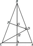 (8分)如图,在△ABC中,∠ABC=45º,CD⊥AB,BE⊥AC,垂足分别为D、E,F为BC中点,BE与DF、DC分别交于点G、H,∠ABE=∠CBE。