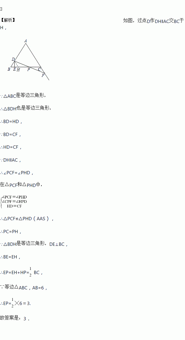如图,已知等边△ABC,AB=6,点D在AB上,点F在AC的延长线上,BD=CF,DF交BC于点P,作DE⊥BC与点E,则EP的长是_____.