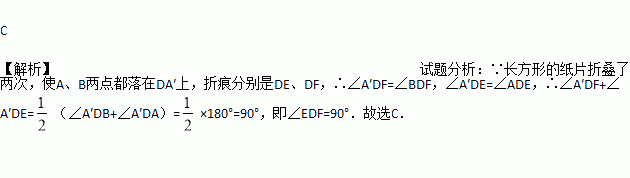 小明同学把一张长方形纸折了两次,如图,使点A、B都落在DG上,折痕分别是DE、DF,则∠EDF的度数为( )