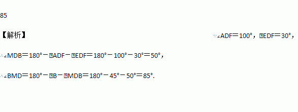 一副三角形叠在一起如图放置,最小锐角的顶点D恰好放在等腰直角三角形的斜边AB上,BC与DE交于点M.如果∠ADF=100°,那么∠BMD为________度;