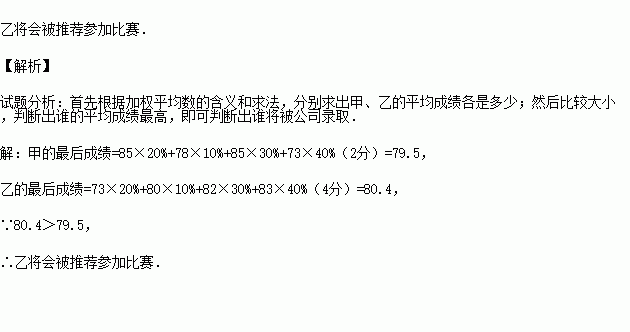学校将表达能力、阅读理解、综合素质和汉字听写分别以20%、10%、30%、40%记入个人最后成绩,并根据成绩择优推荐,请你通过计算说明谁将被推荐参加比赛?