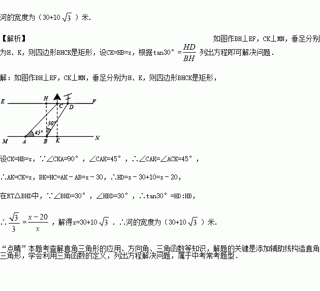 在综合实践课上,小聪所在小组要测量一条河的宽度,如图,河岸EF∥MN,小聪在河岸MN上点A处用测角仪测得河对岸小树C位于东北方向,然后沿河岸走了30米,到达B处,测得河对岸电线杆D位于北偏东30°方向,此时,其他同学测得CD=10米.请根据这些数据求出河的宽度.(精确到0.1)(参考数据: