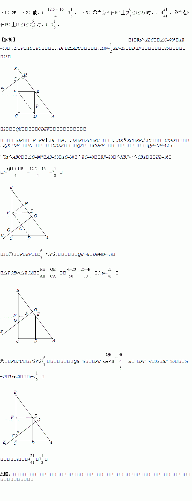 如图,在Rt△ABC中,∠C=90º,AB=50,AC=30,D、E、F分别是AC、AB、BC的中点.点P从点D出发沿折线DE—EF—FC—CD以每秒7个单位长的速度匀速运动;点Q从点B出发沿BA方向以每秒4个单位长的速度匀速运动,过点Q作射线QK⊥AB,交折线BC—CA于点G.点P、Q同时出发,当点P绕行一周回到点D时停止运动,点Q也随之停止.设点P、Q运动的时间是t秒(t>0).
