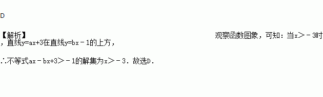 一次函数y=ax+3与y=bx﹣1的图象如图所示,其交点B(﹣3,m),则不等式ax﹣bx+3>﹣1的解集表示在数轴上正确的是( )